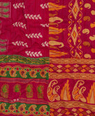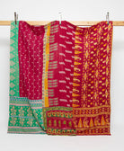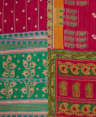 Our queen kantha quilt in a crimson red and marigold yellow geometric pattern is expertly hand-stitched from start to finish using layers of the highest quality vintage cotton saris. Every stitch reflects our dedication to craftsmanship, ensuring each kantha blanket is not only a functional item but also a work of art. With each quilt being completely one-of-a-kind and unique in pattern, it becomes a statement piece in any room it graces. The signature of the artisan maker on the tag also adds a personal connection, allowing you to appreciate the hands that created it.
