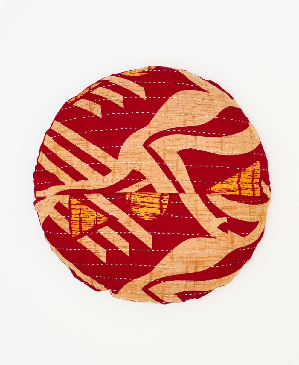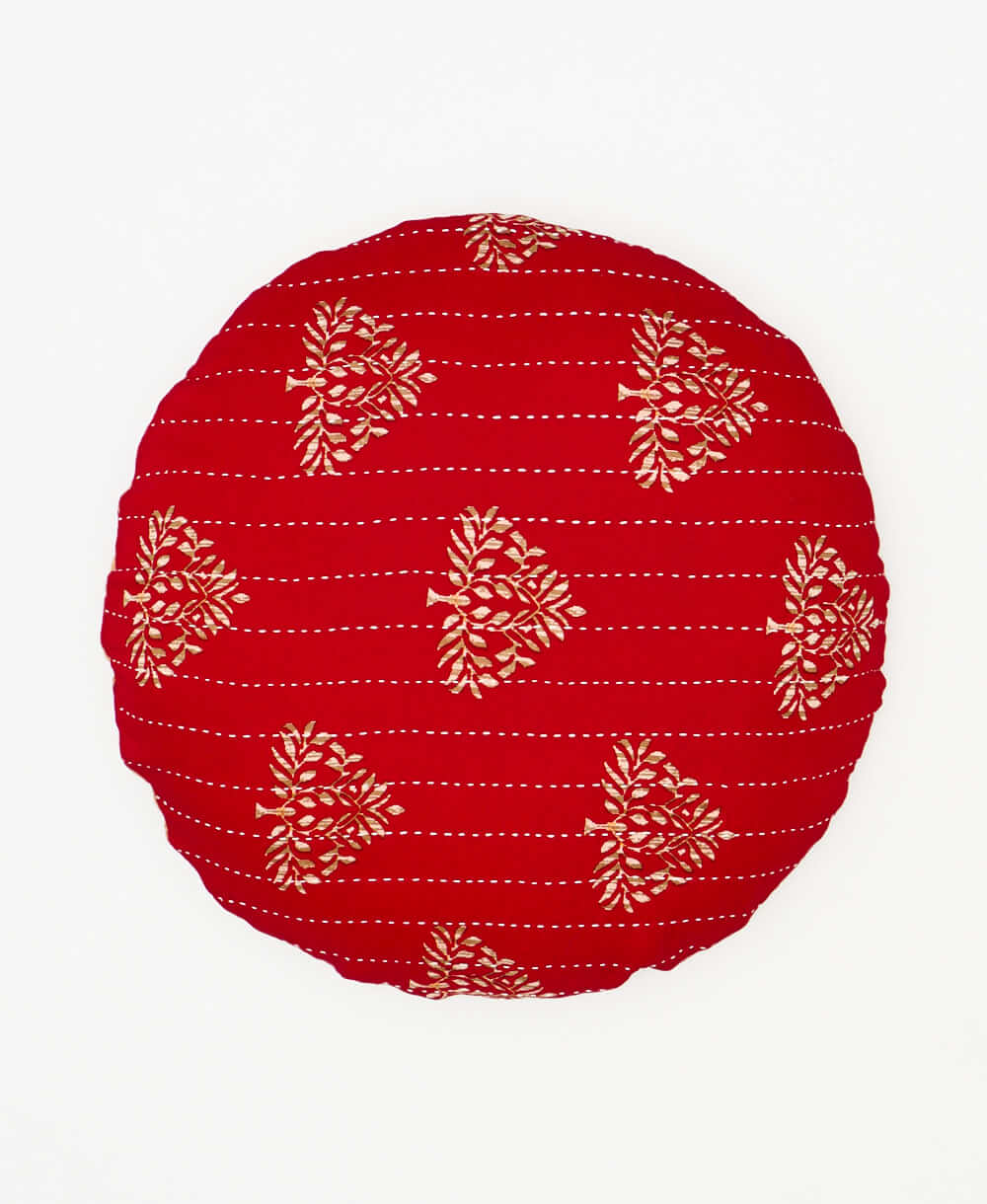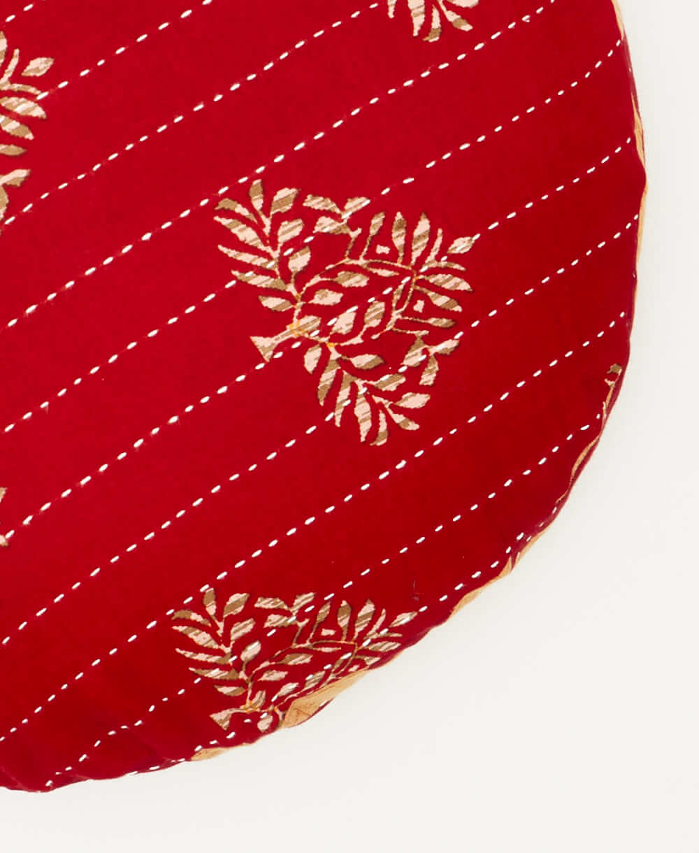 This one-of-a-kind round pillow features a red, green, and white tree print. Each pillow is handcrafted in India from unique upcycled vintage saris and adorned with rows of hand embroidery by skilled women artisans for added texture. The removable down feather insert ensures easy cleaning and provides a luxuriously plush feel. Mix and match different styles to add a modern boho touch to your bedroom or living room.