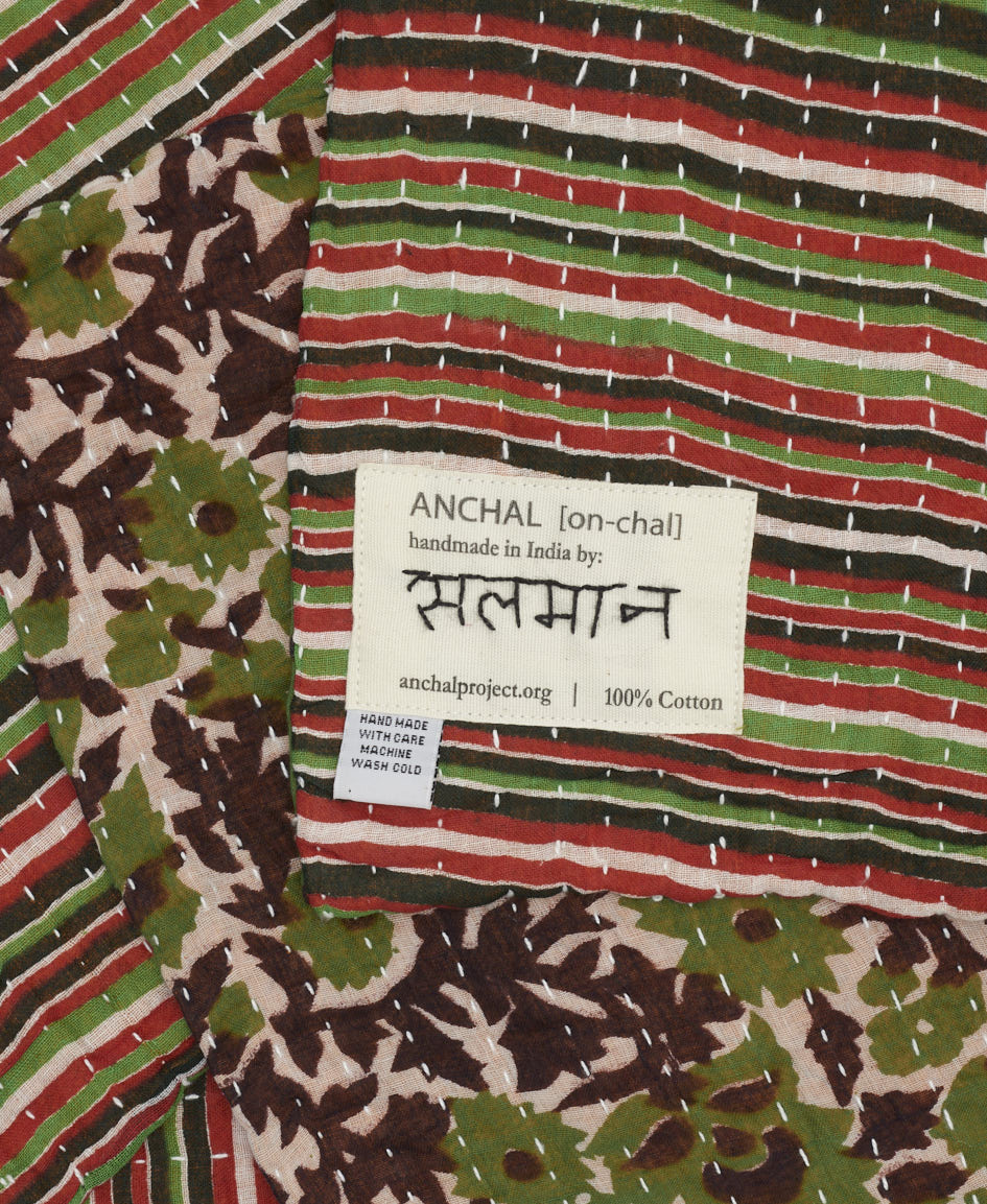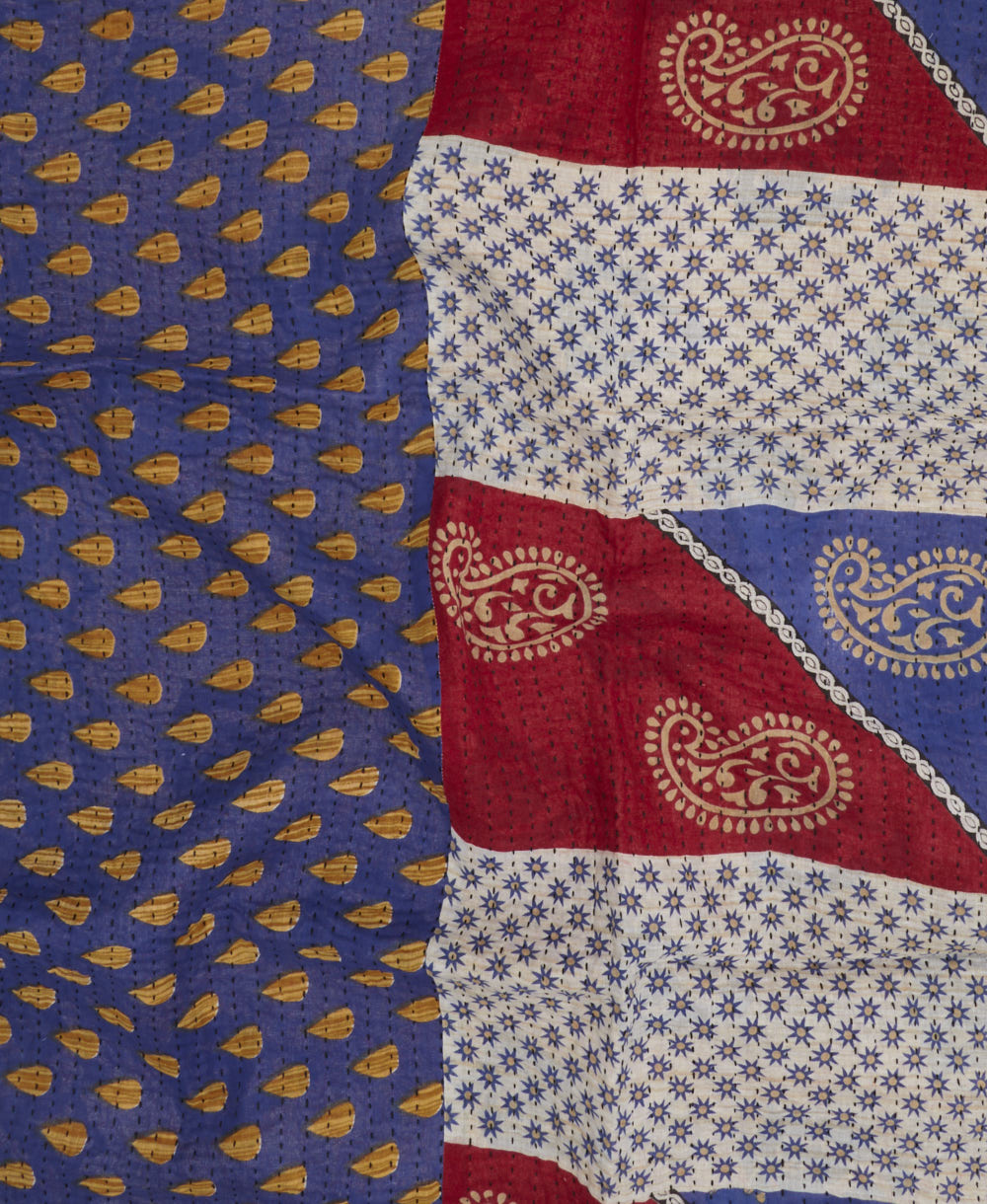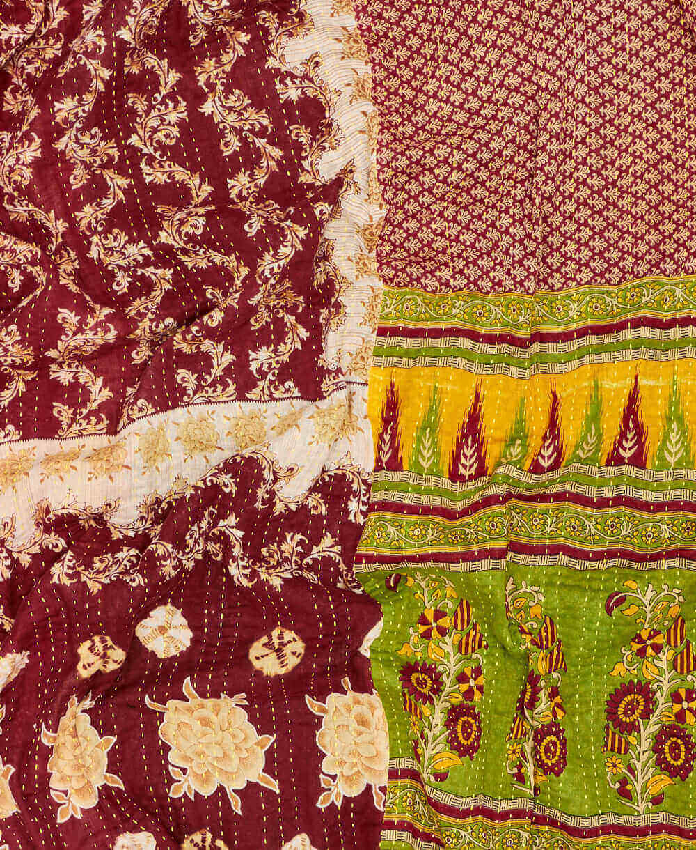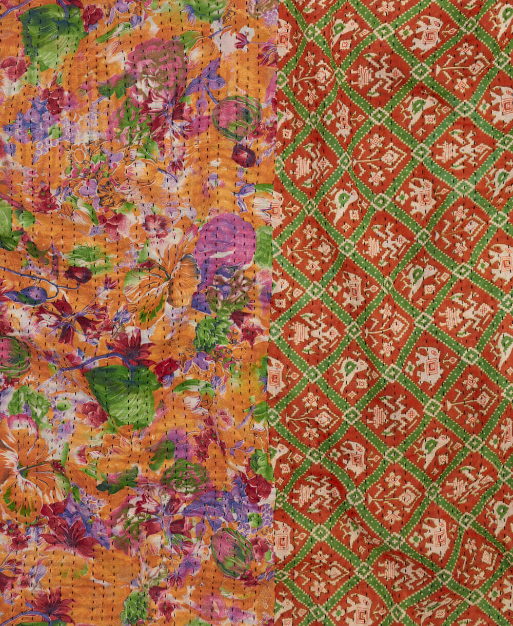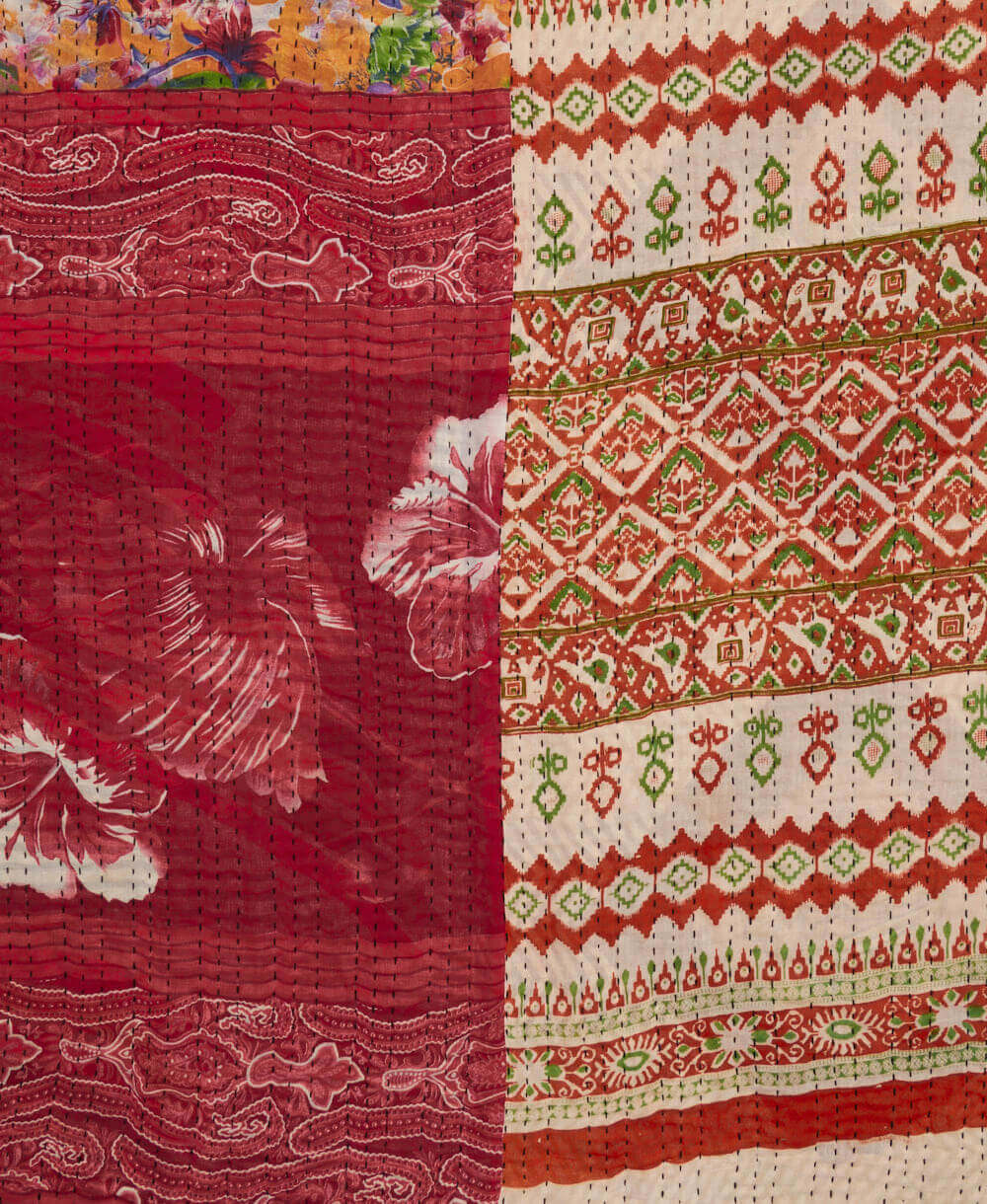 Ethically sourced and handmade with high-quality, upcycled vintage cotton saris, these one-of-a-kind products feature bold, colorful prints. Each kantha product is signed by the woman artisan maker right on the tag. Purposefully made, eco-friendly, and collectible. Shop our selection of kantha quilts, cotton scarves, kantha quilted jackets, lumbar pillows, and more.