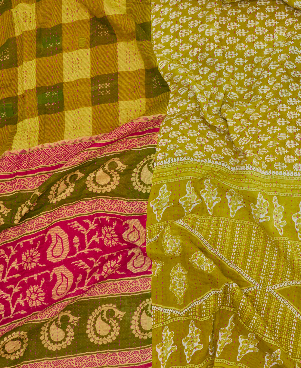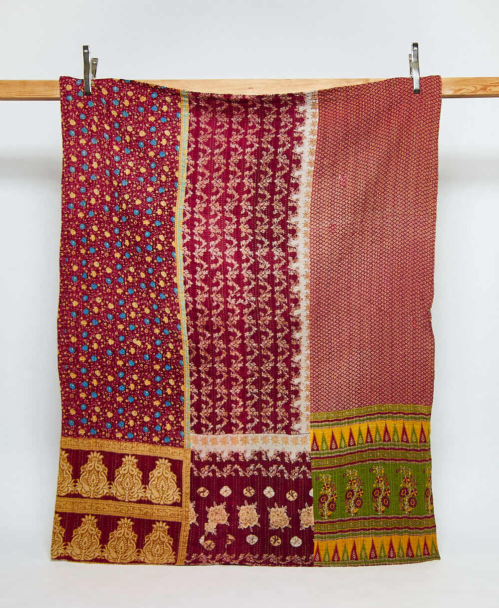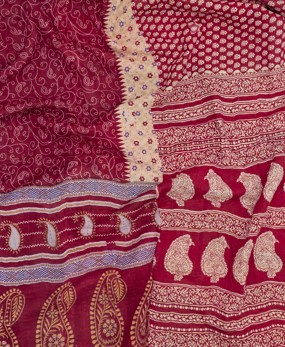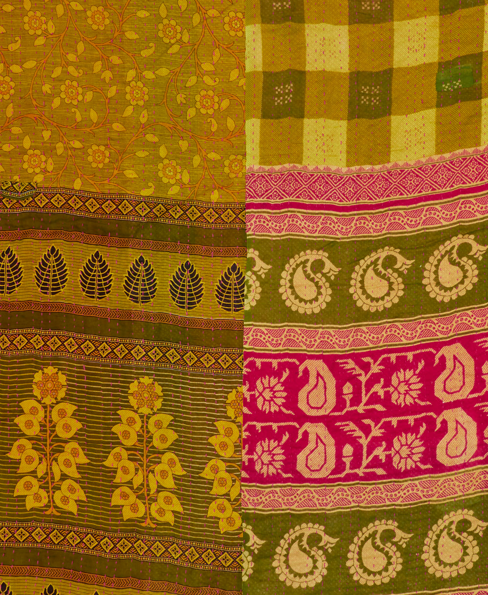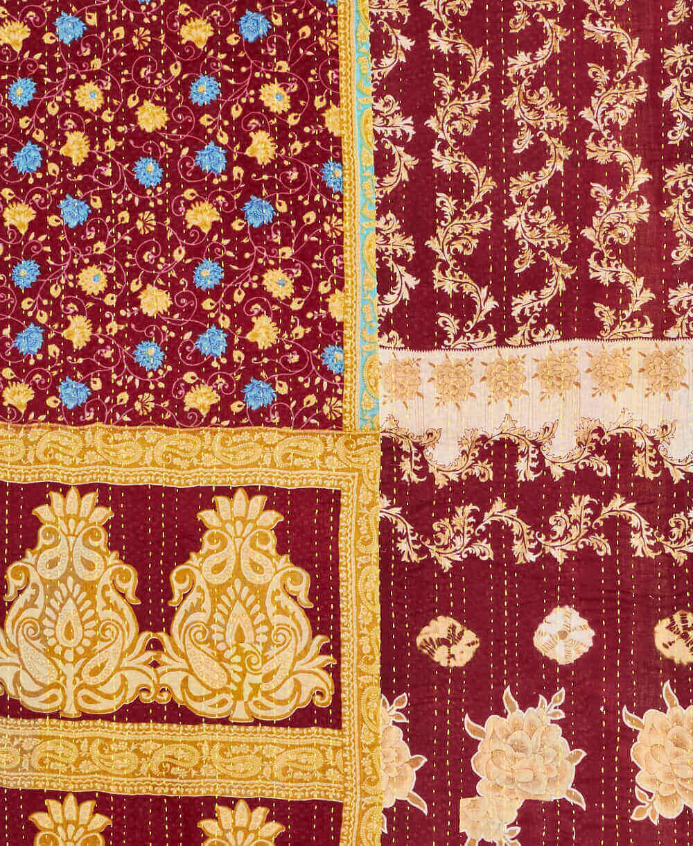 Ethically sourced and handmade with high-quality, upcycled vintage cotton saris, these one-of-a-kind products feature bold, colorful prints. Each kantha product is signed by the woman artisan maker right on the tag. Purposefully made, eco-friendly, and collectible. Shop our selection of kantha quilts, cotton scarves, kantha quilted jackets, lumbar pillows, and more.