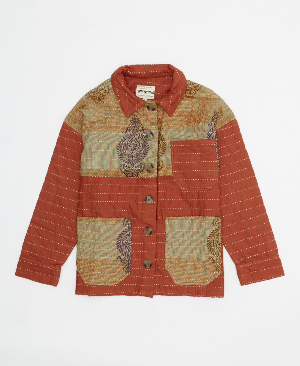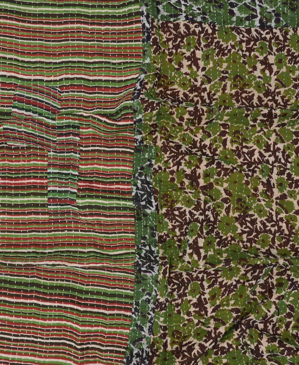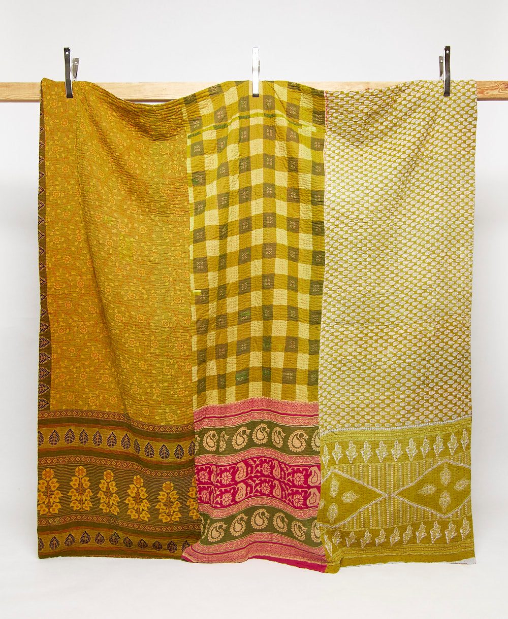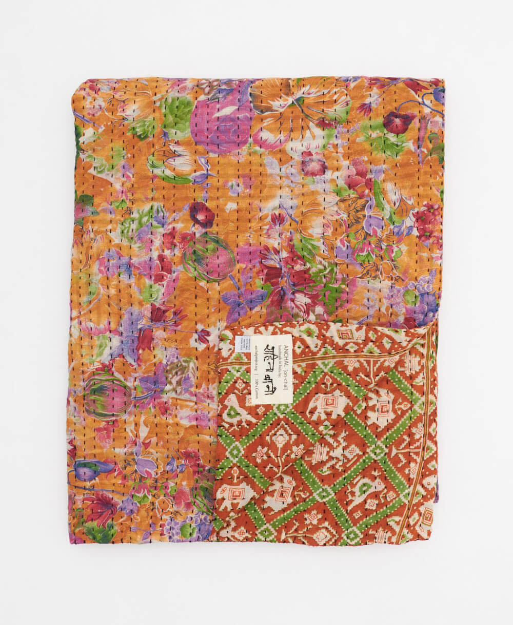 Ethically sourced and handmade with high-quality, upcycled vintage cotton saris, these one-of-a-kind products feature bold, colorful prints. Each kantha product is signed by the woman artisan maker right on the tag. Purposefully made, eco-friendly, and collectible. Shop our selection of kantha quilts, cotton scarves, kantha quilted jackets, lumbar pillows, and more.