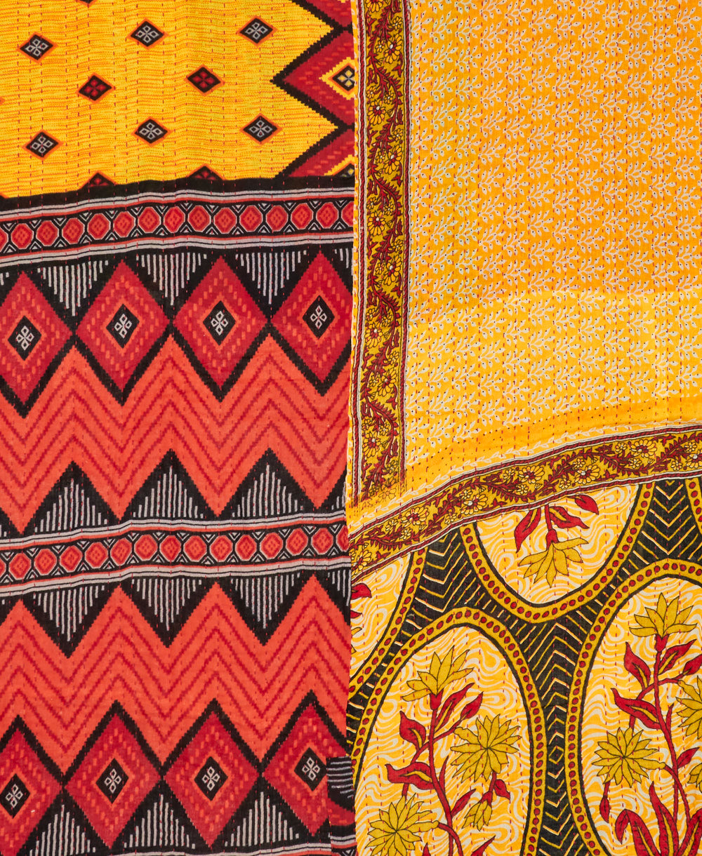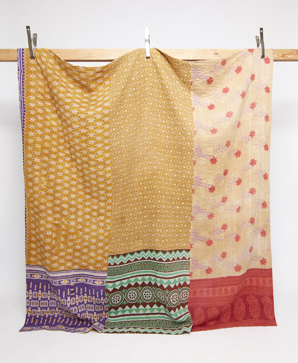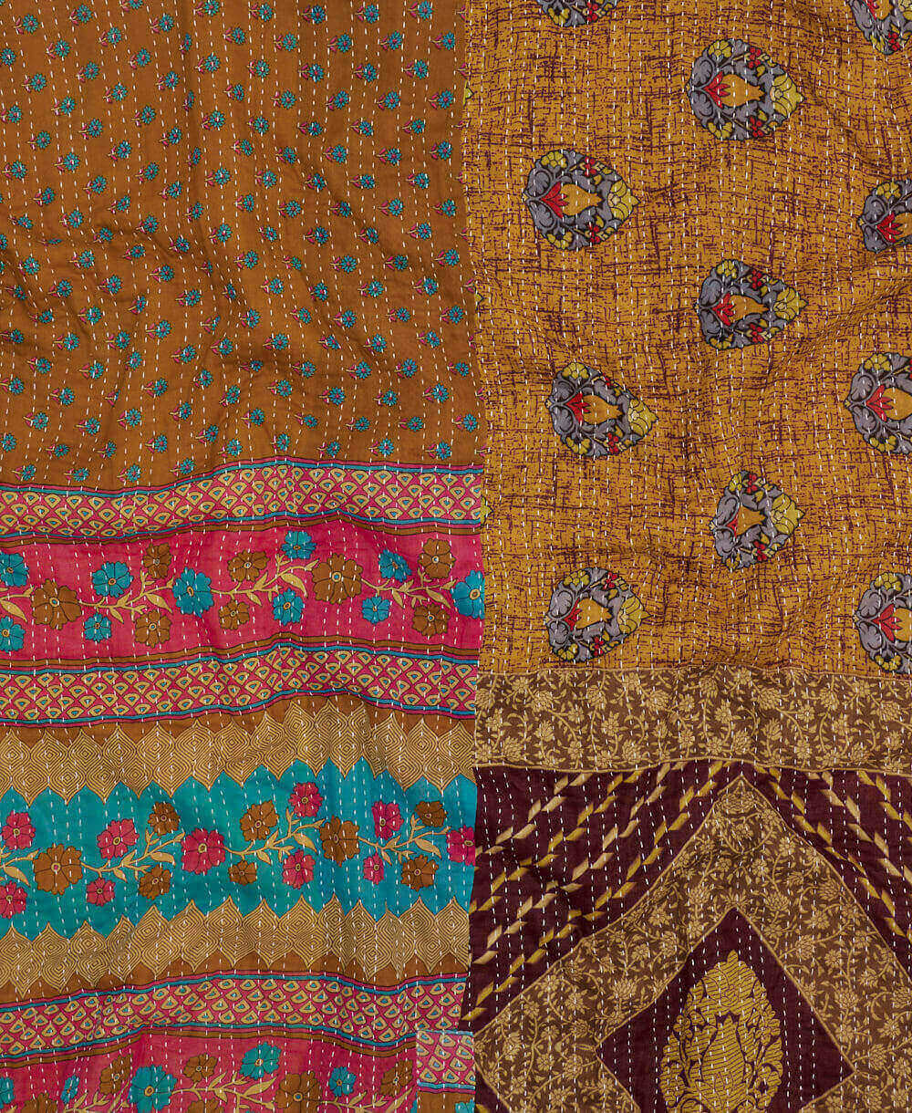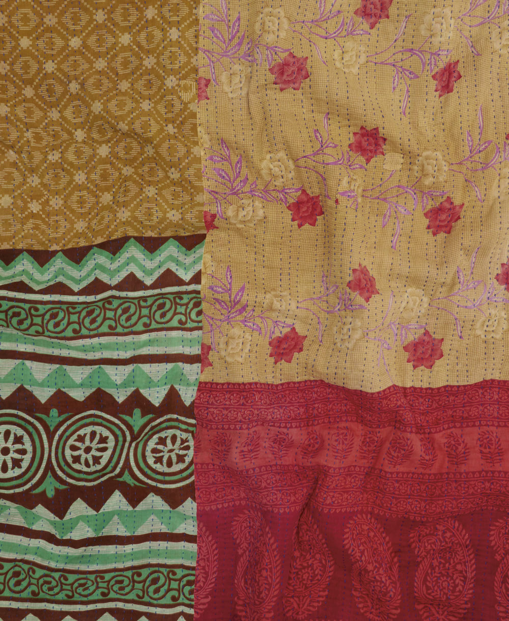 Ethically sourced and handmade with high-quality, upcycled vintage cotton saris, these one-of-a-kind products feature bold, colorful prints. Each kantha product is signed by the woman artisan maker right on the tag. Purposefully made, eco-friendly, and collectible. Shop our selection of kantha quilts, cotton scarves, kantha quilted jackets, lumbar pillows, and more.