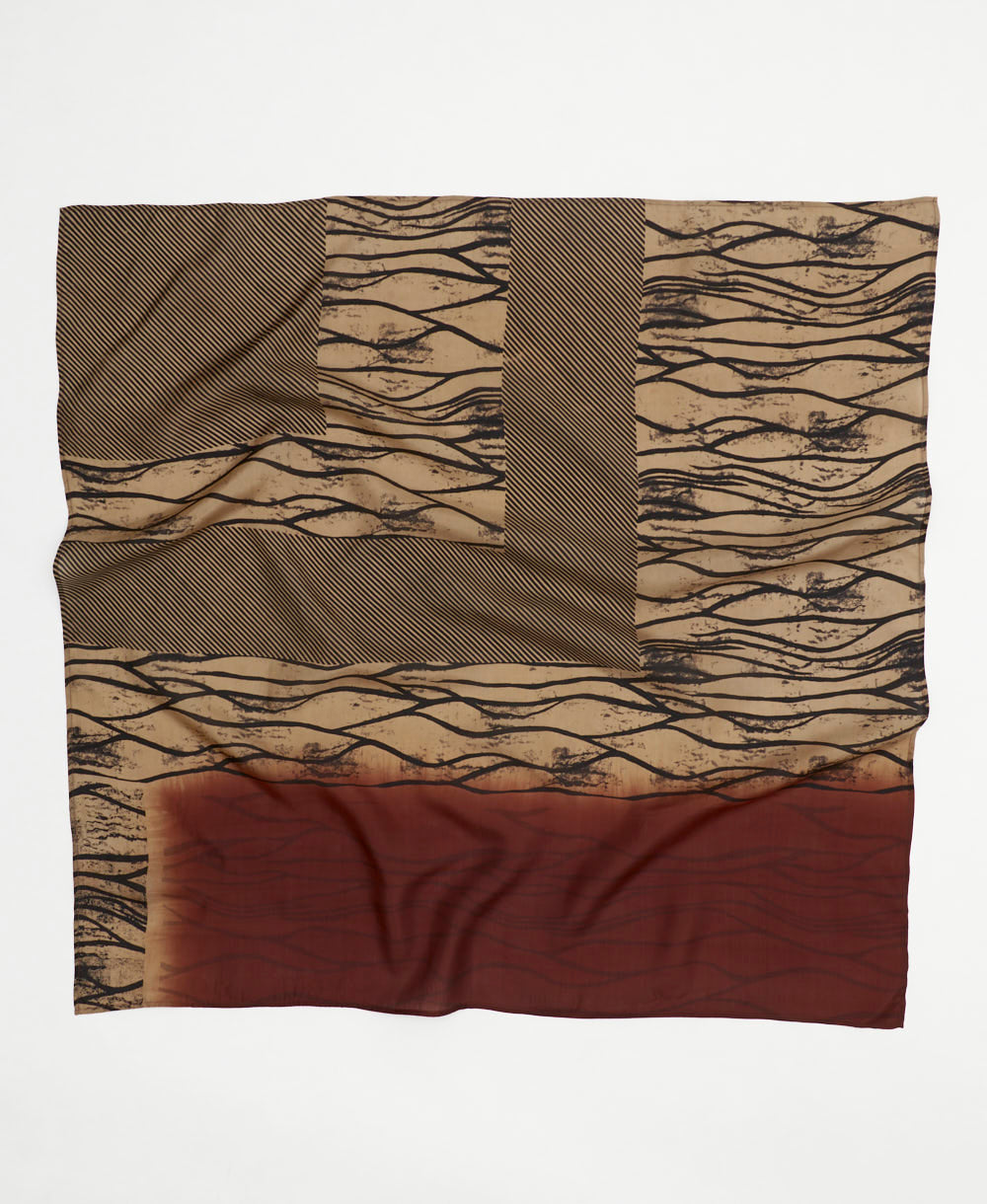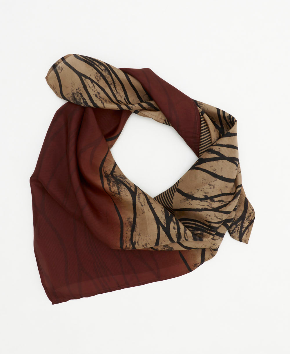 Elevate your everyday style with this tan vintage silk scarf, featuring a black and brown abstract pattern. Crafted from luxurious upcycled silk saris, this eco-friendly accessory is as unique as you are. Its versatile size allows you to wear it in multiple ways—drape it as a headscarf, tie it around your neck, or style it any way you like. Look and feel like a timeless work of art with this one-of-a-kind silk square scarf that you'll reach for again and again.