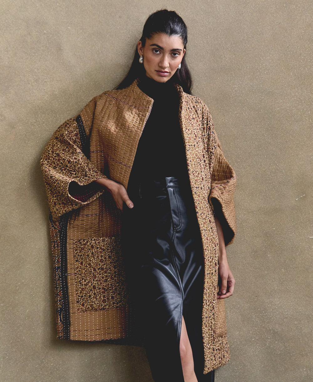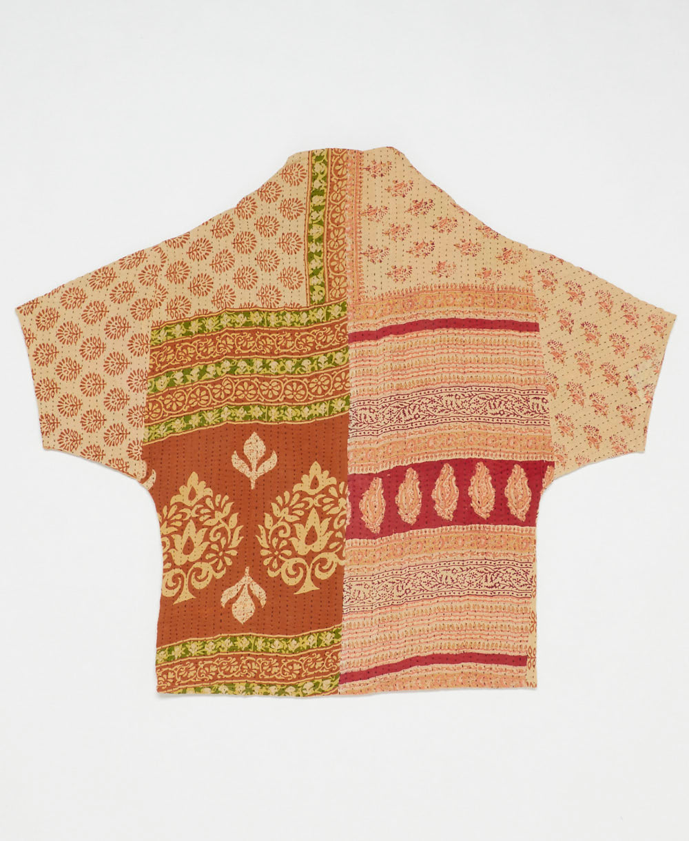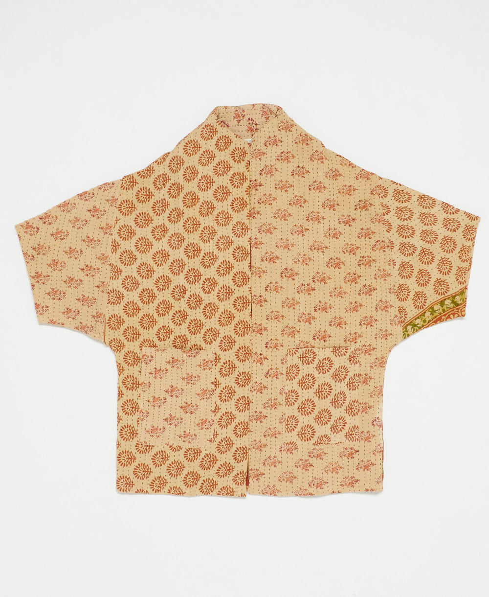 This sandy tan and orange floral print cocoon quilted jacket is truly unique. No two are exactly alike, making it a one-of-a-kind wearable art piece. Constructed from 6 layers of upcycled cotton saris with all-over hand-stitching, this long quilted jacket will make you feel just like you’re cuddling up with your favorite quilt. Featuring two large front patch pockets for convenience and a modern cocoon neckline, this jacket will be one you reach for again and again. Layer it over a t-shirt or your favorite sweater for an effortless feel.