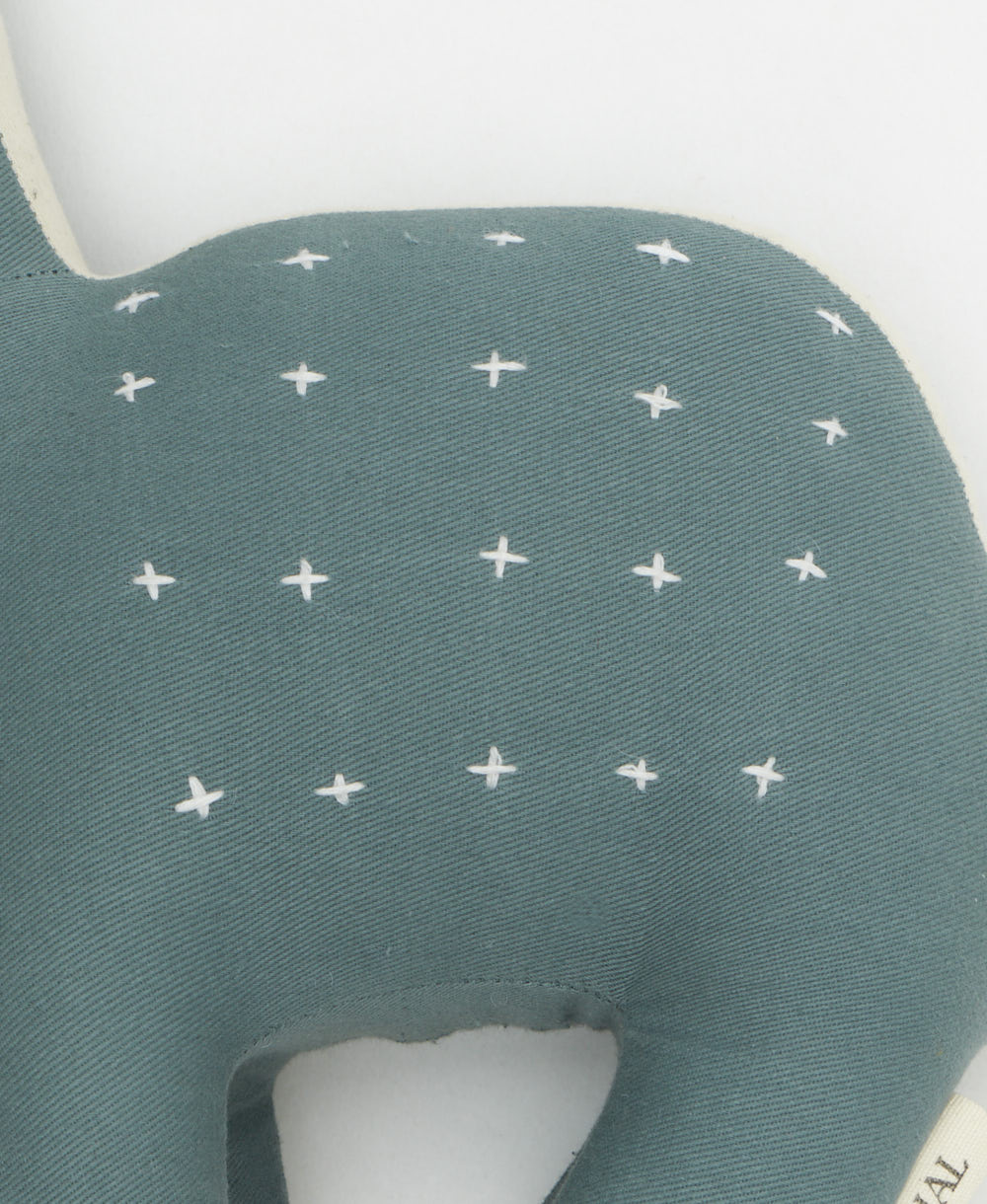 This adorable and eco-friendly stuffed dinosaur features kantha-stitched details and is hand-made from upcycled scrap fabric pieces. Pair it with a small quilt as a perfect gift for an expecting family or keep it for yourself and display it on your favorite bookshelf.