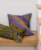 This handcrafted lumbar pillow was created from upcycled vintage cotton saris. With a unique design on each side, it's simple to switch up your decor to match the season or your state of mind. Complete with delightful hand-stitched detailing and a soft down feather insert, this lumbar throw pillow brings a special touch to any bed or sofa.