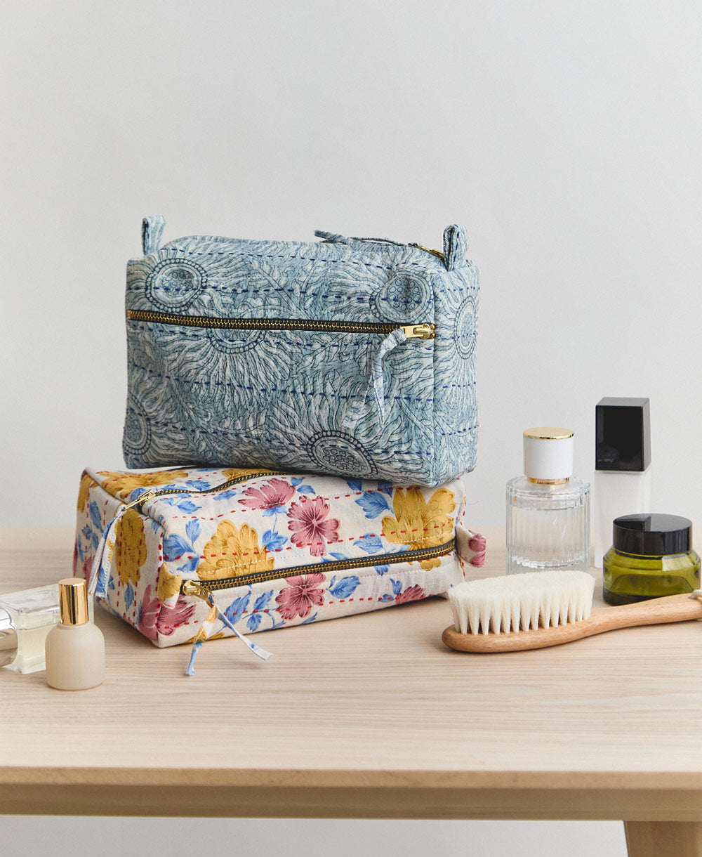 Experience the joy of packing for your trip with our quirky and fun medium toiletry bag, made from upcycled vintage cotton saris. The canvas-lined interior provides structure and the exterior zip pocket offers extra storage. This spacious bag is perfect for storing makeup and makeup brushes or essential toiletries. Don't let its small size fool you, it tucks away easily in a duffle bag or suitcase for convenient travel. Complete your travel bag set with one of our large toiletry bags in a coordinating one-of-a-kind print for a fun and mismatched look.