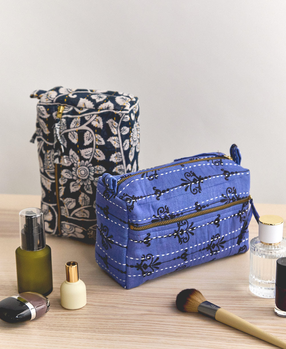 Experience the joy of packing for your trip with our quirky and fun medium toiletry bag, made from upcycled vintage cotton saris. The canvas-lined interior provides structure and the exterior zip pocket offers extra storage. This spacious bag is perfect for storing makeup and makeup brushes or essential toiletries. Don't let its small size fool you, it tucks away easily in a duffle bag or suitcase for convenient travel. Complete your travel bag set with one of our large toiletry bags in a coordinating one-of-a-kind print for a fun and mismatched look.
