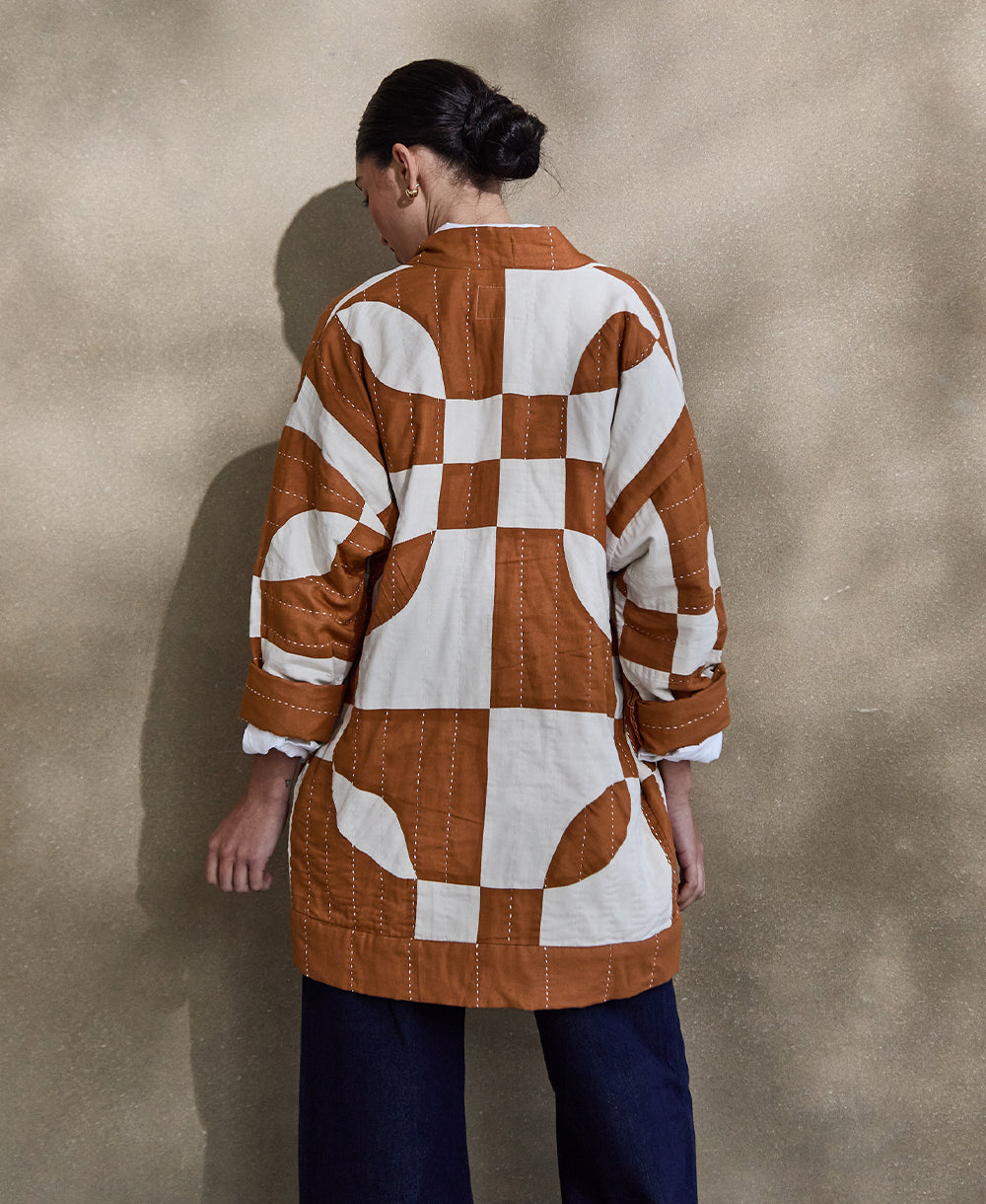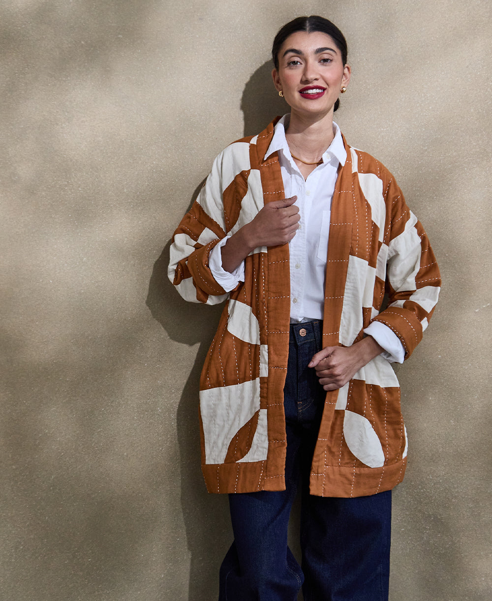 Introducing our collection of quilted, one-of-a-kind jackets made from upcycled saris. Bold colors and intricate hand-stitched embroidery fuses vintage fabrics with modern design – it's a statement piece that doubles as wearable art. Let your style shine with this truly eye-catching piece – you won't find one like it anywhere else!