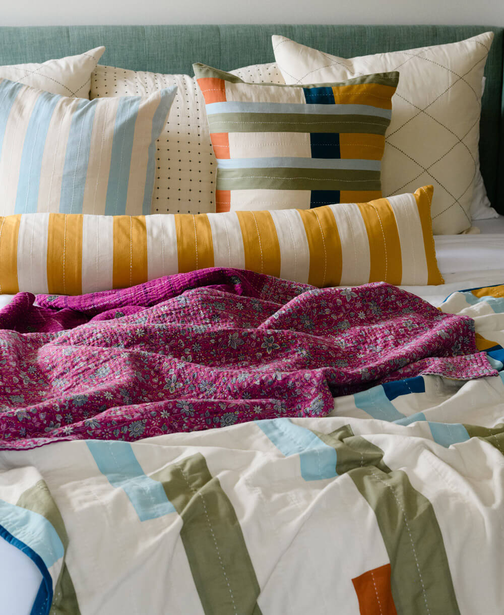 Kantha blankets are cherished Indian quilts, known for their eco-friendly nature and vibrant, unique patterns. This centuries-old craft turns patchwork cloth into stunning works of art, made from repurposed rags. Our Kantha blankets stand out for their amazing craftsmanship and quality. No two are alike, and each quilt is signed by the artisan, adding a special, personal touch to your unique piece.