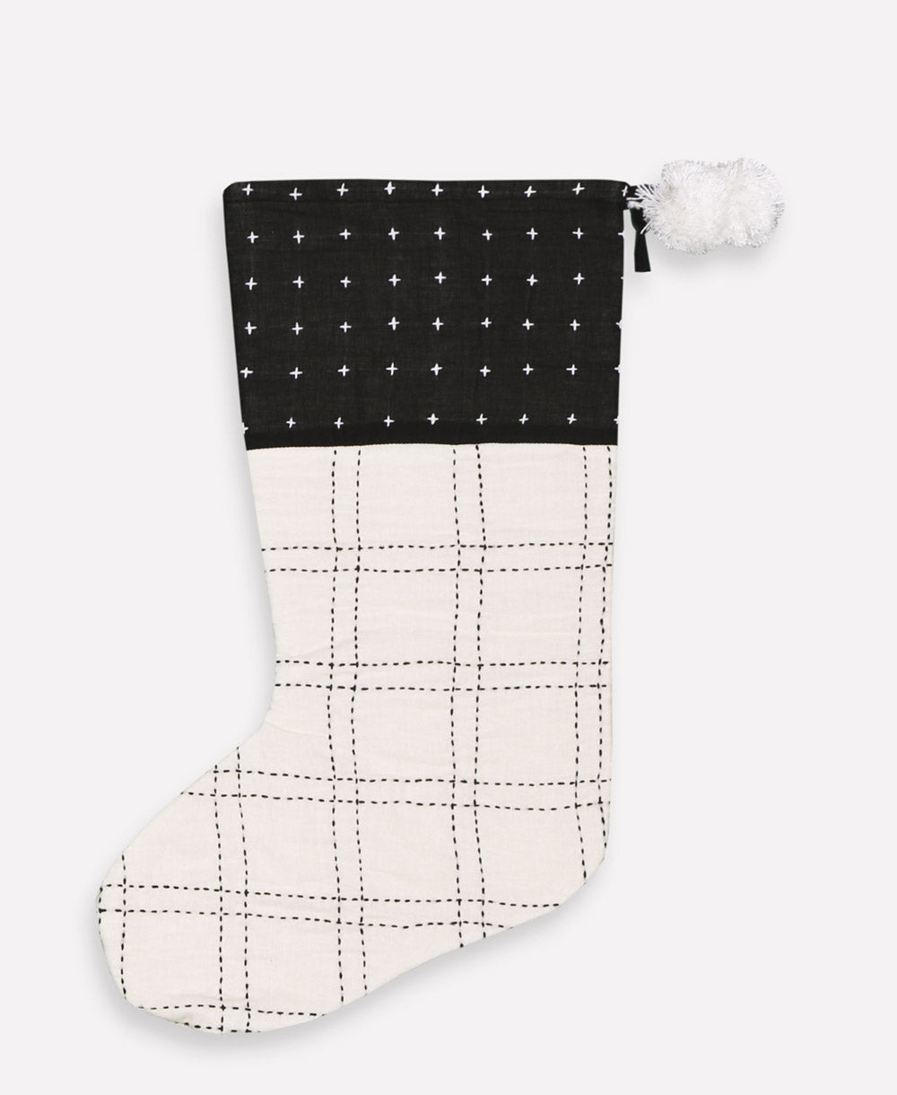 Bring modern elegance to your holiday décor with our monochromatic embroidered stocking. Crafted from 100% organic cotton and lined with durable canvas, this stocking is built to hold small gifts, candy, and more. The hand-embroidered grid design, along with two playful pom-pom accents, adds a touch of contemporary charm. Perfect for decking your mantel in timeless black and white, this stocking is designed to be a holiday favorite you'll treasure year after year.